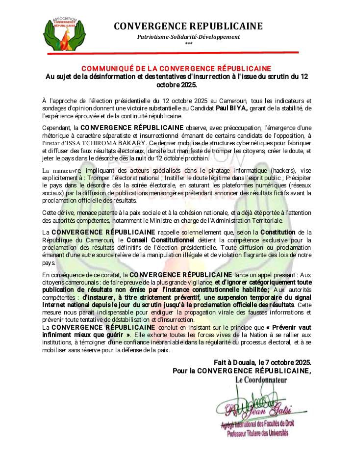 Pour la Convergence républicaine, l’Internet est devenu un outil de manipulation électorale : des rumeurs viralement partagées, des faux comptages annoncés ou des appels à la désobéissance massifs. «…le Conseil constitutionnel détient la compétence exclusive pour la publication des résultats définitifs de l’élection présidentielle », affirme le Pr Jean Gatsi, dans son communiqué rendu public.