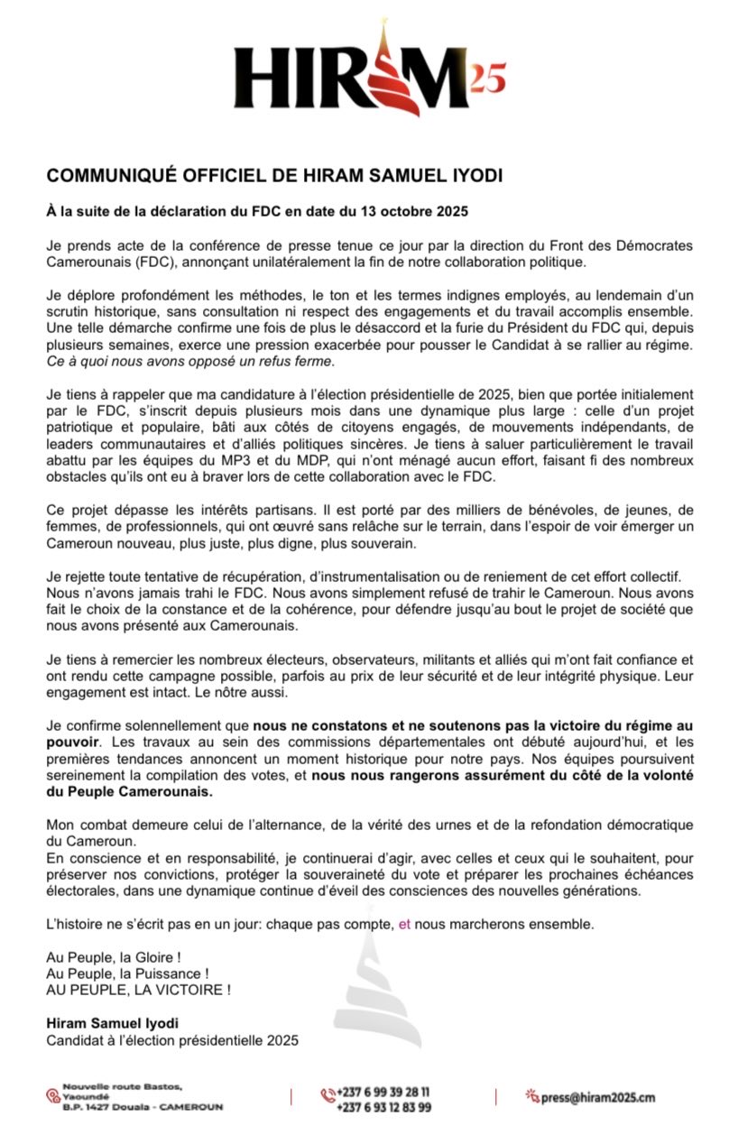 Dans un communiqué officiel rendu public ce 13 octobre 2025, le candidat à l'élection présidentielle Hiram Samuel Iyodi a annoncé la fin de sa collaboration avec le Front des Démocrates Camerounais. Cette décision intervient après que la direction du FDC ait tenu une conférence de presse pour acter unilatéralement la rupture. Le candidat a exprimé ses profonds regrets concernant les méthodes et le ton employés par cette formation politique, qu'il qualifie d'indignes au lendemain d'un scrutin historique.