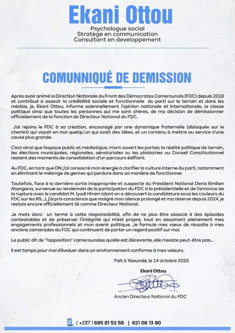 La rupture définitive est intervenue à la suite de la récente conférence de presse du président Atangana, tenue après l'élection présidentielle et l'annonce de la rupture avec le candidat Hiram Iyodi. Ekani Ottou affirme avoir découvert la candidature de ce dernier sous la bannière du FDC sur les réseaux sociaux, un mode de fonctionnement qu'il désapprouve. Cette démission politique souligne les profonds désaccords stratégiques au sein de la direction du parti et illustre une crise interne qui dépasse le simple cadre personnel.