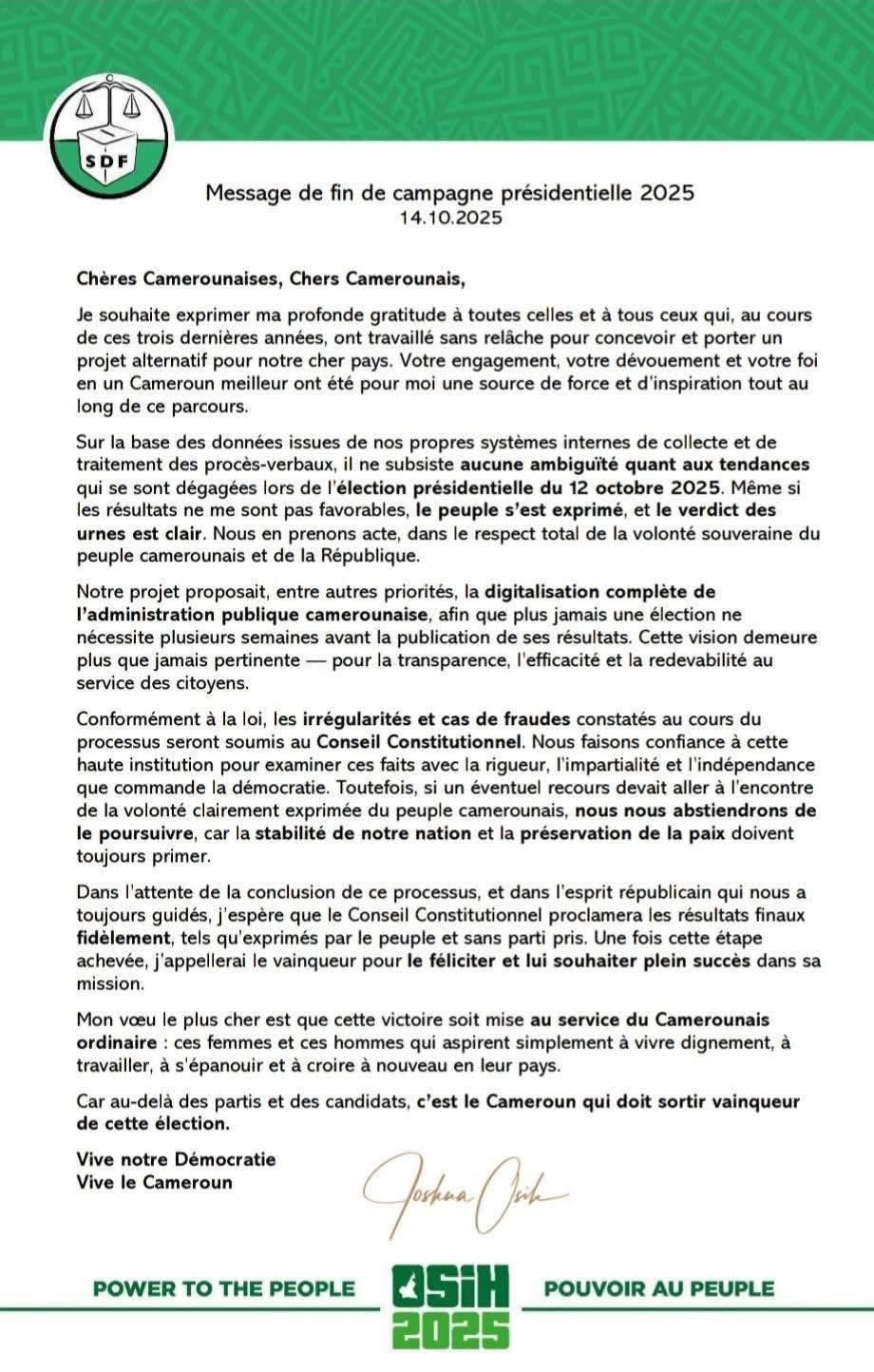 Dans un message adressé à la nation camerounaise, Joshua Osih a fait une déclaration majeure concernant l'élection présidentielle du 12 octobre 2025. Le candidat a exprimé sa "profonde gratitude" envers tous ceux qui ont porté son "projet alternatif" durant trois années de campagne intensive. Son discours, marqué par une hauteur de vue remarquable, souligne l'importance du respect des institutions et de la préservation de la paix nationale dans cette période cruciale pour la démocratie camerounaise.