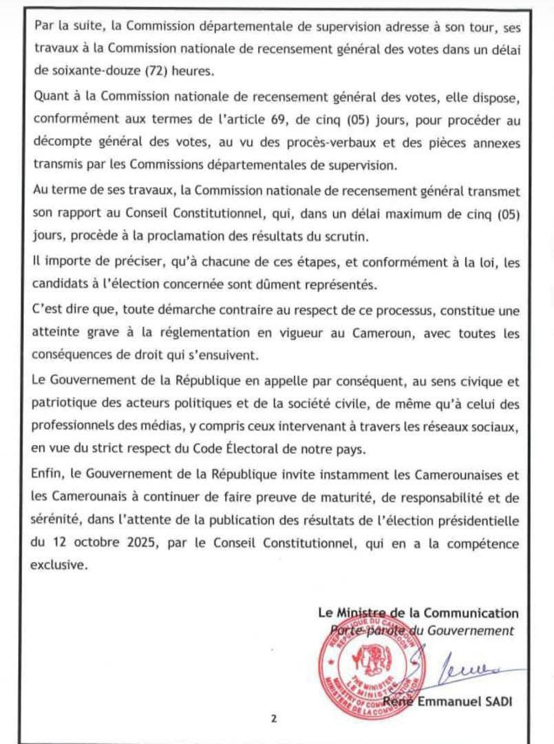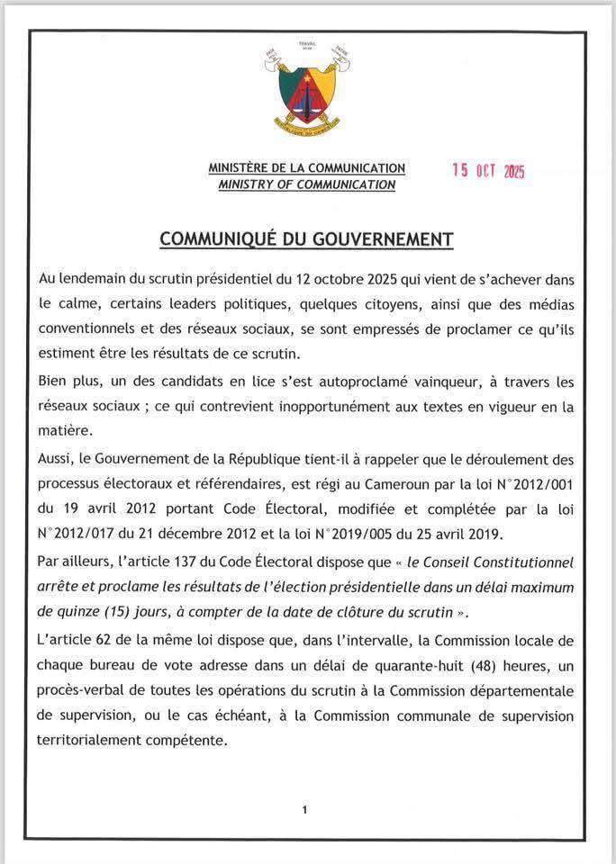 Le gouvernement souligne que toute démarche contraire à ce processus constitue une violation des textes en vigueur. Il en appelle au civisme des acteurs politiques, de la société civile et des médias, y compris ceux intervenant sur les réseaux sociaux, pour garantir la transparence et la crédibilité du scrutin. Les Camerounais sont invités à faire preuve de patience et de responsabilité dans l’attente des résultats officiels.