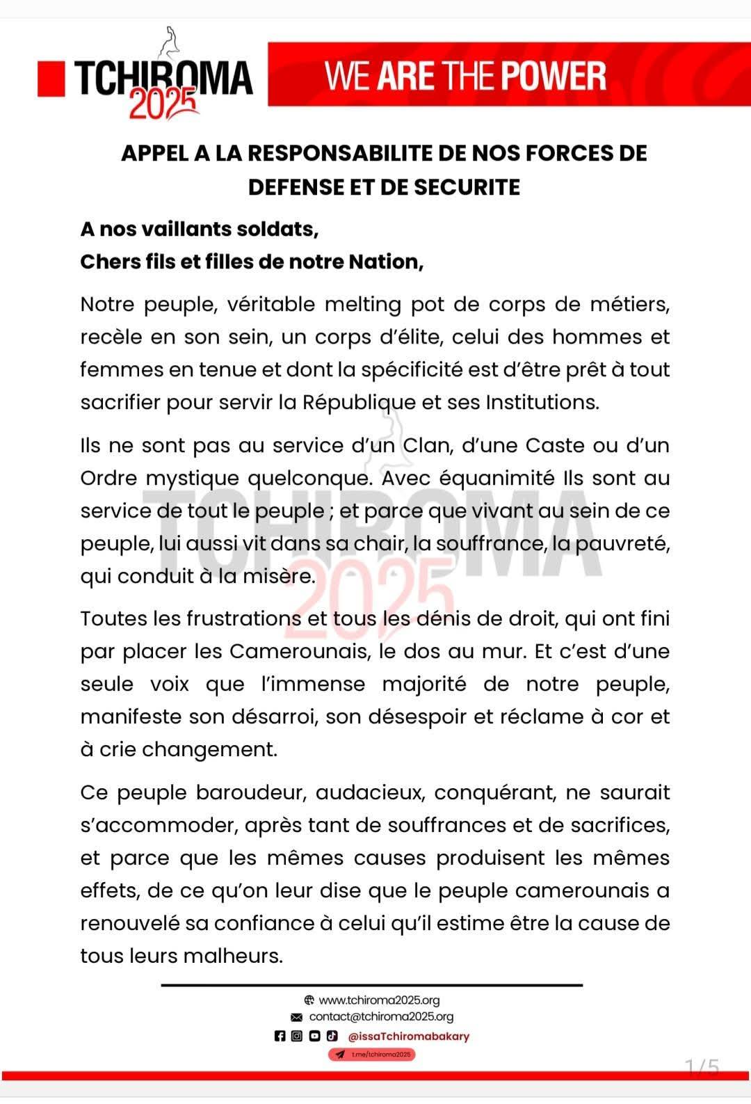 Il rappelle avec force que l'armée et la police ne sont pas au service d'un clan au pouvoir ou d'une caste, mais qu'elles sont dévouées à la République et à l'ensemble du peuple camerounais. Ce plaidoyer pour la neutralité des forces armées survient dans un contexte où la pression populaire pour la transparence du scrutin ne cesse de croître. Tchiroma décrit un peuple "baroudeur, audacieux, conquérant" qui, après "tant de souffrances et de sacrifices", ne saurait accepter un déni de sa volonté exprimée dans les urnes.