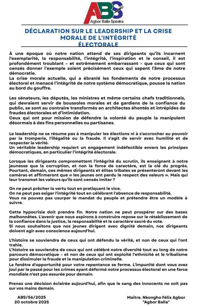 La déclaration met en lumière le comportement hypocrite des élites qui prêchent la vertu tout en pratiquant le vice. Sénateurs, députés, ministres et certains chefs traditionnels sont pointés du doigt pour leur rôle dans la manipulation de la volonté populaire. Agbor Balla souligne avec amertume que ces mêmes dirigeants qui sapent la démocratie osent ensuite reprocher aux jeunes leur manque de valeurs, alors qu'ils offrent eux-mêmes le spectacle navrant de la corruption érigée en système.