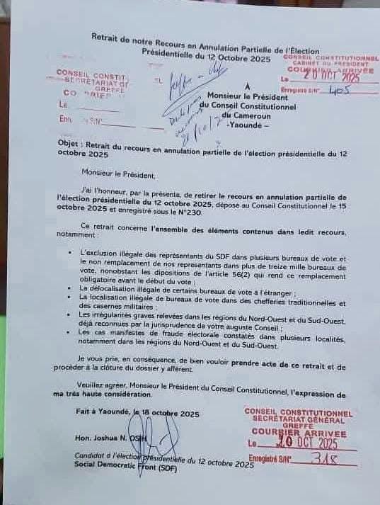 Le SDF retire son recours électoral : un coup de théâtre dans la présidentielle camerounaise :: CAMEROON