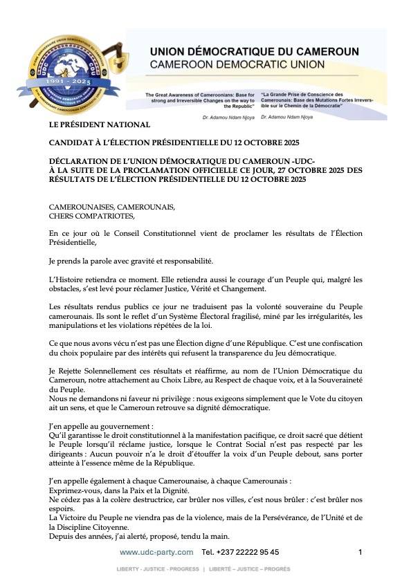 Dans une déclaration solennelle, Tomaïno Ndam Njoya, présidente de l'Union démocratique du Cameroun et candidate à l'élection présidentielle du 12 octobre 2025, a rejeté avec fermeté les résultats proclamés par le Conseil constitutionnel. S'exprimant avec gravité, elle a estimé que ces résultats « ne traduisent pas la volonté souveraine du Peuple camerounais », dénonçant un système électoral miné par les irrégularités et les manipulations. Pour elle, le scrutin du 12 octobre n'était pas une élection digne d'une république, mais bien une « confiscation du choix populaire ».