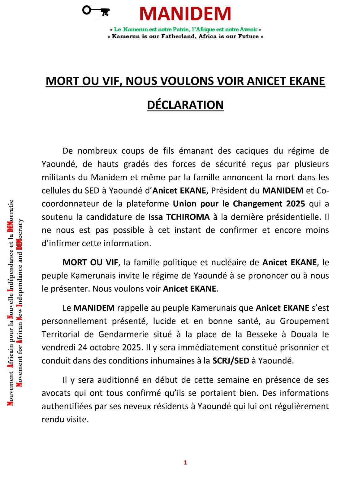 La déclaration politique est sans équivoque : « Mort ou vif, nous voulons voir Anicet Ekane ». Le parti demande au régime de Yaoundé de se prononcer officiellement et d'apporter des preuves de vie, ce qui est devenu un enjeu majeur dans le climat délétère qui suit la crise post-électorale. Le MANIDEM rappelle que, selon les informations de ses militants à Yaoundé et de sa famille, Anicet Ekane se serait présenté personnellement et en bonne santé au Groupement Territorial de Gendarmerie à Bèssèkè, Douala, le 24 octobre 2025.