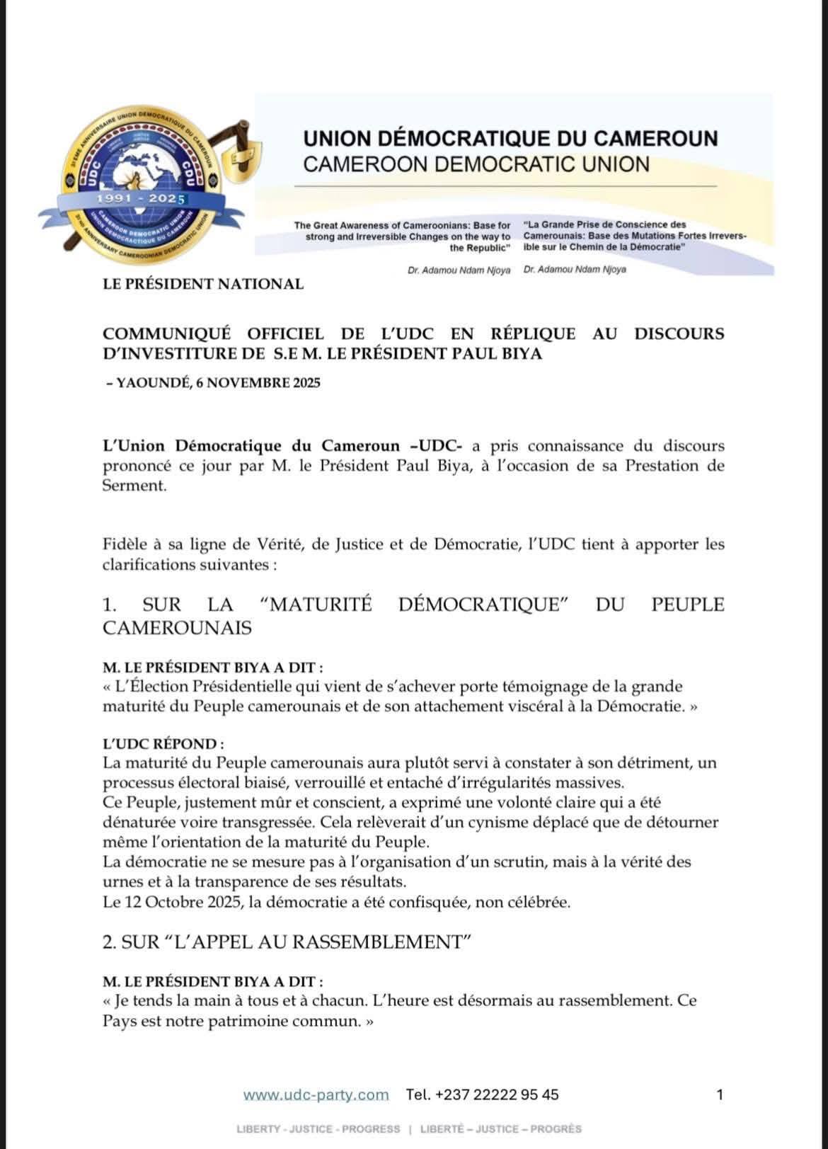 À la suite de la prestation de serment de S.E.M. le Président Paul Biya, le paysage politique camerounais s'est immédiatement trouvé secoué par une réponse cinglante de l'opposition. En première ligne, l'Union Démocratique du Cameroun (UDC) a publié un communiqué retentissant le 6 novembre 2025, rejetant fermement les conclusions du scrutin et le discours présidentiel. Ce document, signé par le candidat à la présidentielle Hon. Tomaino Ndam Njoya, ne se contente pas d'une simple contestation, il établit un réquisitoire détaillé contre le processus électoral jugé « biaisé, verrouillé et entaché d'irrégularités massives ».