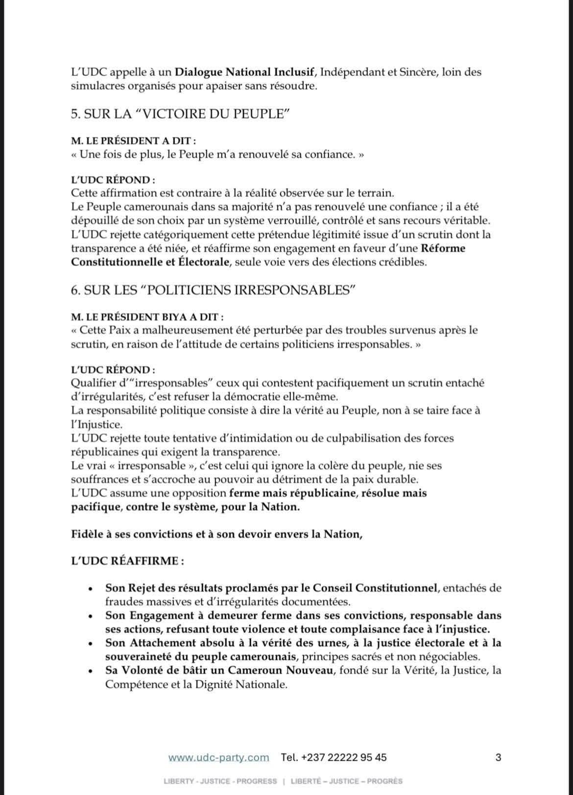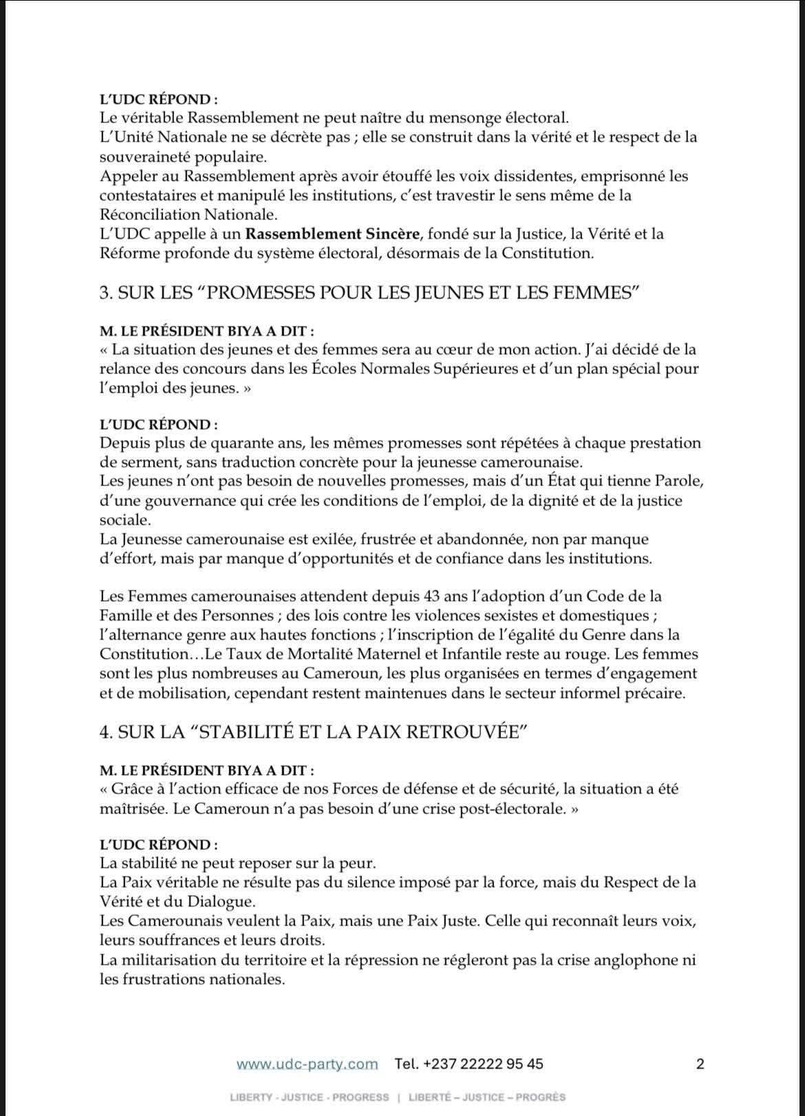 La première salve de l'UDC vise la notion de « maturité démocratique » évoquée par Paul Biya. L'opposition rétorque que la démocratie a été non pas célébrée, mais « confisquée » par un mécanisme électoral qui a dénaturé la volonté claire du peuple. Pour l'UDC, qualifier d'« irresponsables » ceux qui contestent pacifiquement un scrutin aussi vicié relève du cynisme et d'une tentative de dédouanement de l'État face à l'injustice. L'UDC réaffirme sa position d'une opposition ferme mais républicaine, dont la responsabilité première est d'apporter la vérité au peuple .