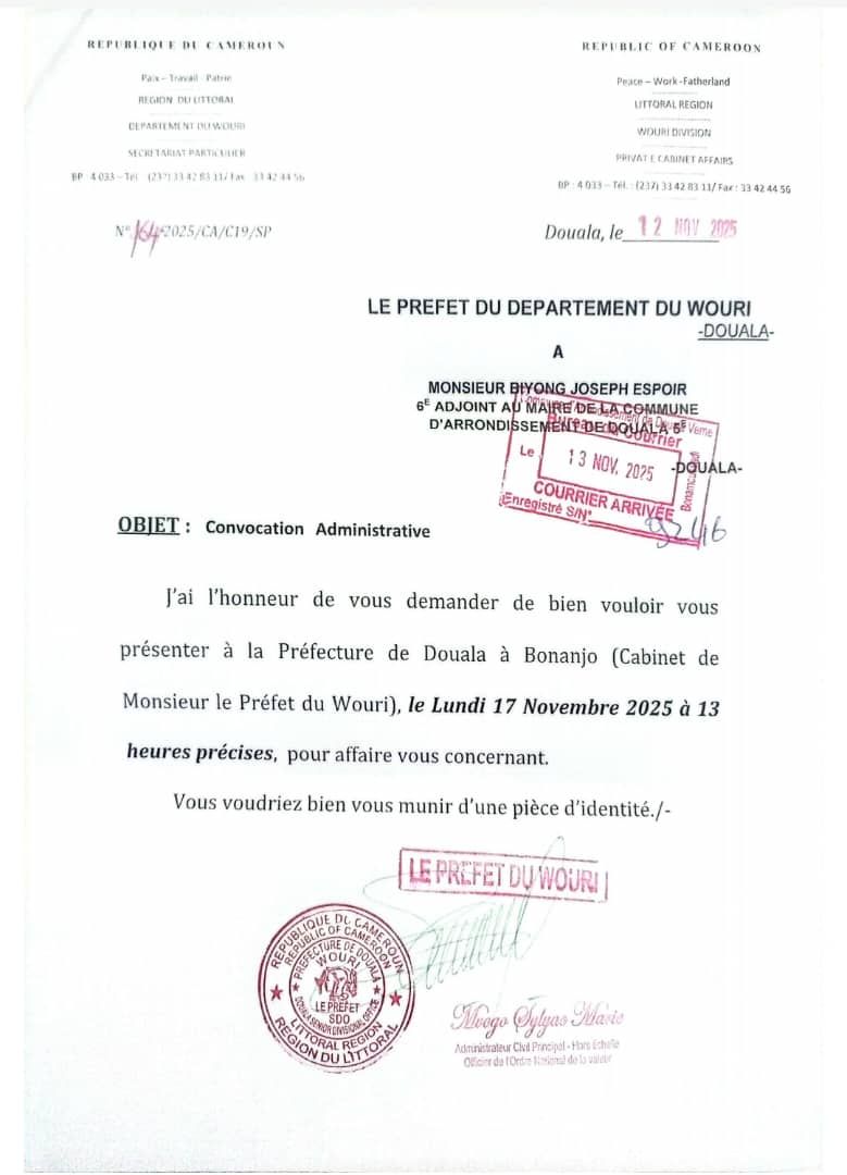 L'actualité politique à Douala s'intensifie avec la convocation officielle de Monsieur Biyong Joseph Espoir, 6e Adjoint au Maire de la Commune d'Arrondissement de Douala 5e. Datée du 12 novembre 2025 et signée par le Préfet du Département du Wouri, la convocation administrative exige la présence de l'élu au Cabinet du Préfet le lundi 17 novembre 2025 à 13 heures précises, pour une "affaire vous concernant". Bien que le document soit de nature formelle, le contexte politique brûlant dans lequel elle survient suscite de vives inquiétudes et fait l'objet d'une interprétation unanime au sein de l'opposition.