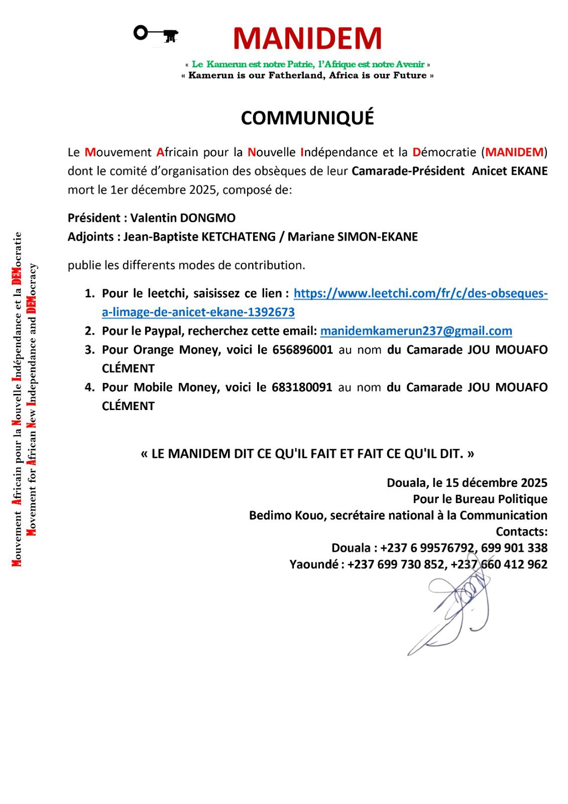 L'émotion suscitée par le décès tragique et prématuré d'Anicet EKANE, l'opposant camerounais emblématique et figure historique du nationalisme de gauche, a transcendé les frontières et ravivé un élan de solidarité populaire. Face à cette perte immense pour le Mouvement Africain pour la Nouvelle Indépendance et la Démocratie (MANIDEM) et l'ensemble de la scène politique, la famille et les camarades du défunt se mobilisent pour lui organiser des obsèques à la mesure de son combat anticolonialiste et panafricaniste, une lutte à laquelle il a consacré plus d'un demi-siècle de sa vie. Cet événement, qui résonne comme un dernier hommage au "Camarade-Président", nécessite une mobilisation financière pour être digne d'un héros national.