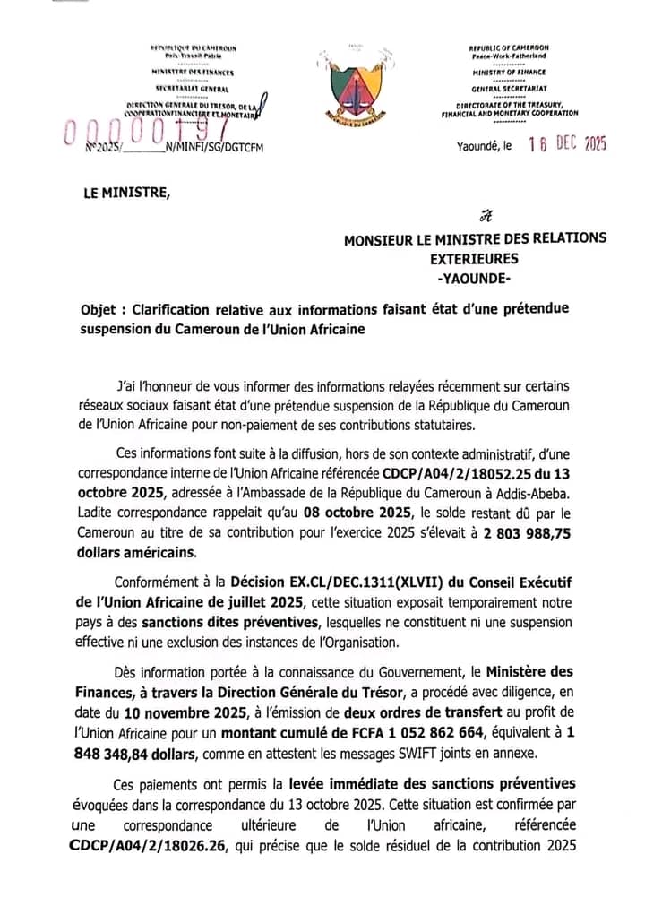 Le gouvernement camerounais vient d'apporter un démenti formel aux rumeurs persistantes relayées sur les réseaux sociaux concernant une éventuelle mise au ban du pays par l'organisation continentale. Dans une correspondance officielle datée du 16 décembre 2025, le Ministre des Finances a tenu à clarifier la situation administrative et financière du pays vis-à-vis de l'institution basée à Addis-Abeba. Cette mise au point intervient après la diffusion hors contexte d'un courrier interne de l'instance africaine qui mentionnait des retards de contributions statutaires, alimentant ainsi des théories infondées sur une exclusion pure et simple du pays.