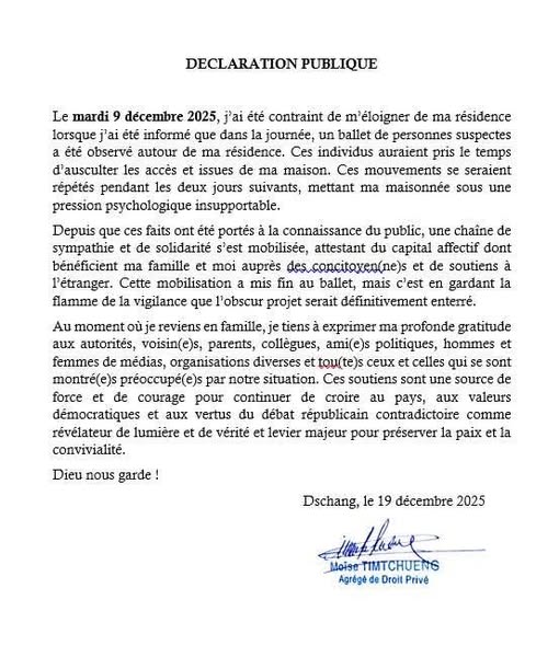 Dans une déclaration publique datée du 19 décembre 2025, le Professeur Moïse Timtchueng a finalement annoncé son retour auprès de sa famille, mettant fin à plusieurs jours d'incertitude. Il a tenu à exprimer sa profonde gratitude envers la chaîne de sympathie qui s'est mobilisée dès que les faits ont été portés à la connaissance du public, attestant de l'important capital affectif dont il bénéficie auprès de ses concitoyens. Bien que l'épreuve ait été particulièrement éprouvante, l'universitaire réaffirme son attachement aux valeurs démocratiques et aux vertus du débat républicain contradictoire. Cette issue positive démontre que la vigilance collective reste un levier majeur pour préserver la paix et la convivialité au sein de la nation.