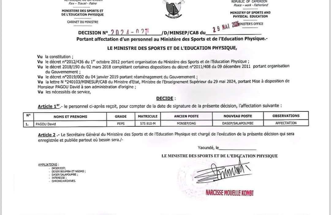 Le parcours de David Pagou pour atteindre ce banc de touche ressemble à une course d'obstacles institutionnelle. Au plus fort du conflit entre la fédération et le gouvernement, sa nomination par Samuel Eto'o avait déclenché une réaction radicale du pouvoir public. Le ministre des Sports, Mouelle Kombi, avait alors ordonné son affectation immédiate à Salapoumbé, une localité extrêmement enclavee du département de la Boumba-et-Ngoko. Ce bannissement administratif visait alors à entraver le fonctionnement du nouveau staff technique et à affirmer l'autorité ministérielle sur les décisions fédérales. Pourtant, le technicien n'a jamais abdiqué, transformant cet exil forcé en une période de préparation mentale intense.