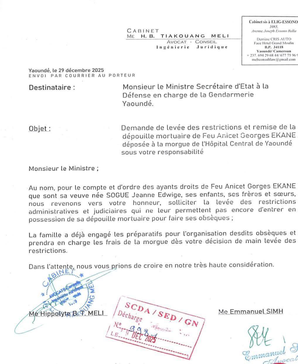 L’actualité judiciaire et politique camerounaise est marquée ce lundi par une démarche officielle et solennelle entreprise par les conseils de la famille de feu Anicet Georges Ekane. Dans une correspondance datée du 29 décembre 2025, les avocats Me Hippolyte Meli et Me Emmanuel Simh ont saisi officiellement le Secrétaire d’État à la Défense chargé de la Gendarmerie nationale afin d’obtenir la levée des restrictions pesant sur la dépouille de l’illustre disparu. Cette demande de remise du corps, déposé à la morgue de l’Hôpital Central de Yaoundé sous la responsabilité directe des autorités de défense, met en lumière les tensions administratives et judiciaires qui entourent encore ce dossier sensible.
