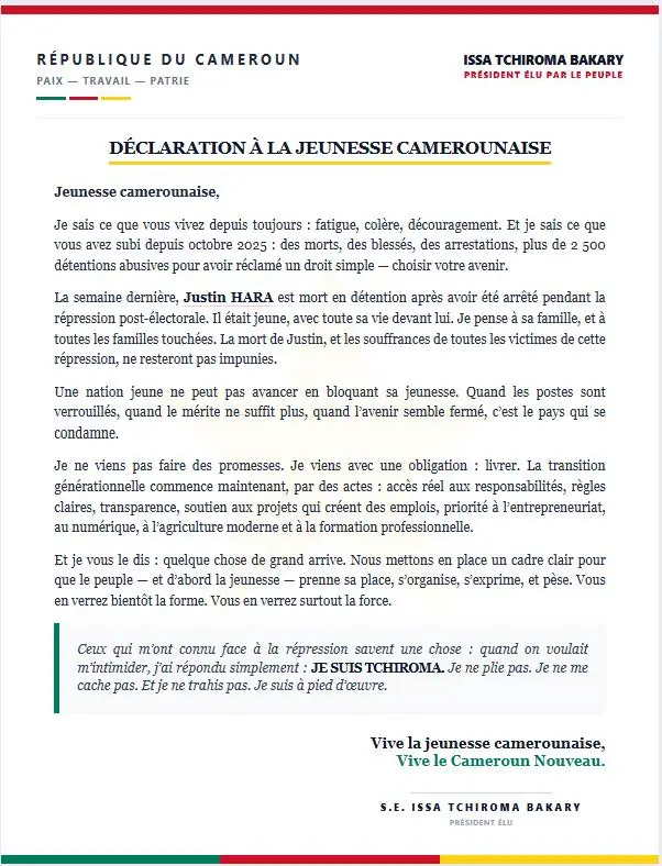 Issa Tchiroma Bakary, président élu du Cameroun, vient de publier sa première déclaration officielle à la jeunesse camerounaise. Un texte sobre, direct, qui rompt avec les promesses électorales classiques. Le ton est posé, l'engagement ferme. Mais derrière les mots, une réalité explosive : Justin Hara, jeune militant, est mort en détention pendant la répression post-électorale.