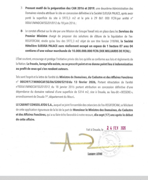 Annulation, titre foncier de la société Djeuga Palace à Douala : Note d'information du Cabinet Atou