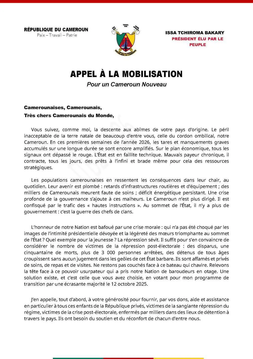 Cinquante morts, trois mille arrestations, un État en faillite technique. Les chiffres avançés par Issa Tchiroma Bakary frappent les esprits. Dans un appel publié le 27 février 2026, celui qui se présente comme "président élu par le peuple" dresse un réquisitoire sans concession contre le régime en place. Il invite la diaspora camerounaise à se mobiliser pour une transition politique.