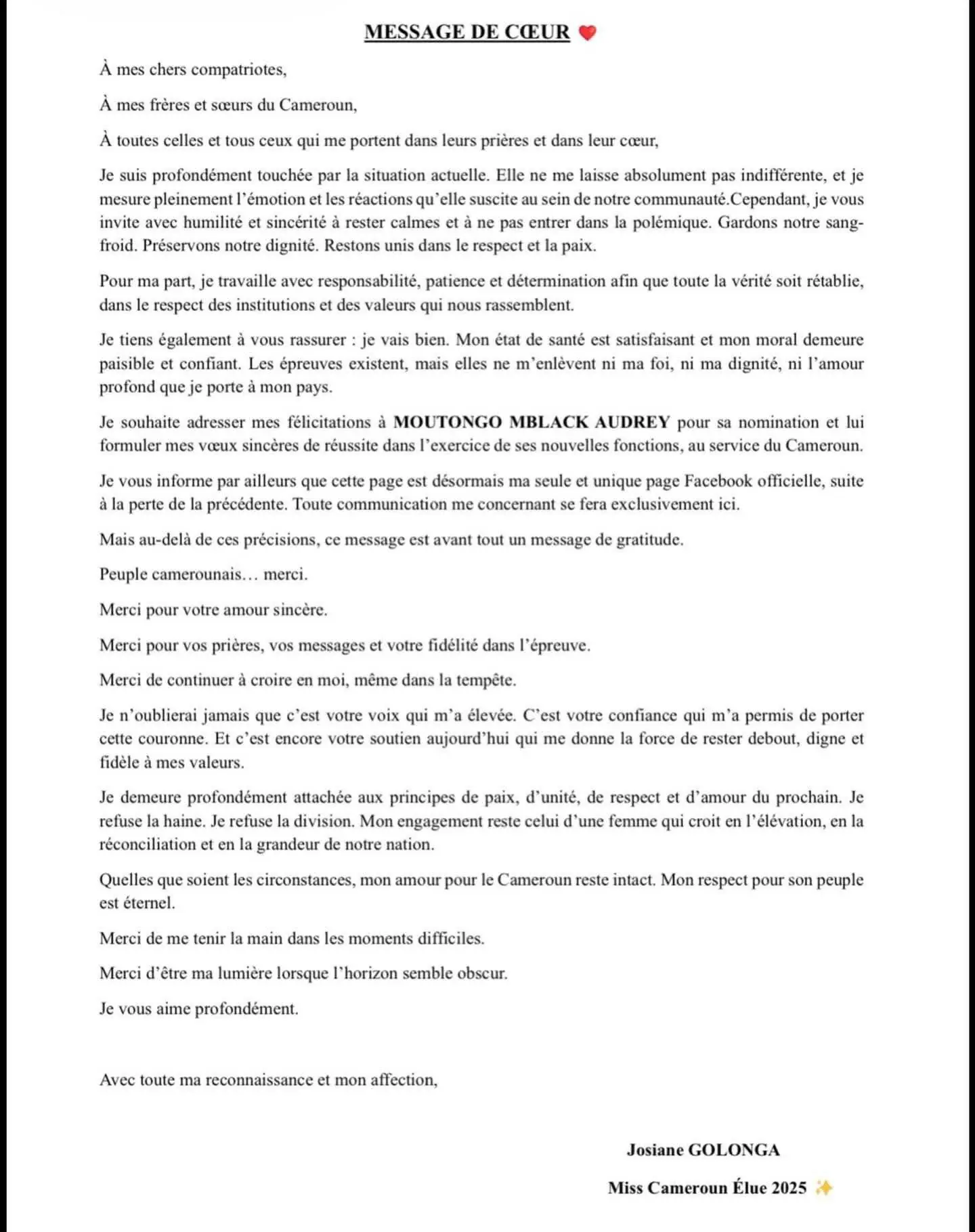 Josiane Golonga, Miss Cameroun élue 2025, a pris la parole. Dans un long message publié sur sa nouvelle page Facebook officielle, elle s'adresse à ses compatriotes après ce qu'elle qualifie de "situation actuelle". Sans entrer dans les détails, elle évoque les épreuves traversées et tient à rassurer sur son état de santé et son moral. "Je vais bien", écrit-elle, affirmant sa détermination à ce que "toute la vérité soit rétablie".