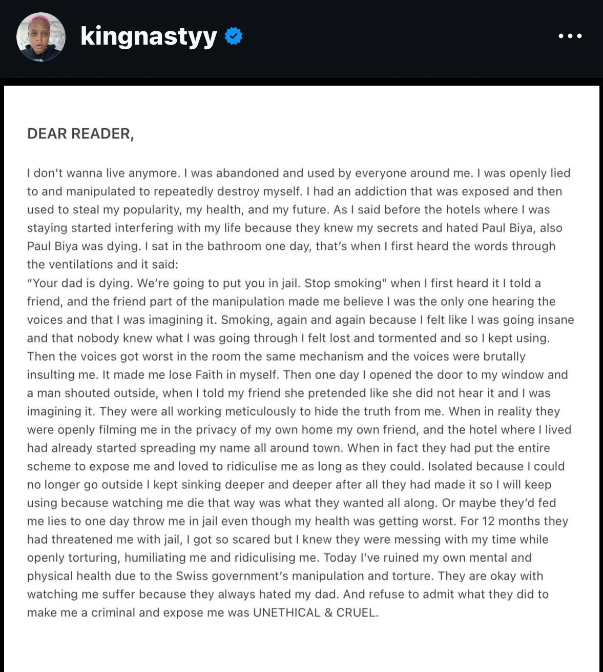 « I don’t wanna live anymore. » La fille du président camerounais a publié un texte bouleversant. Elle dit avoir été poussée à se détruire elle-même.