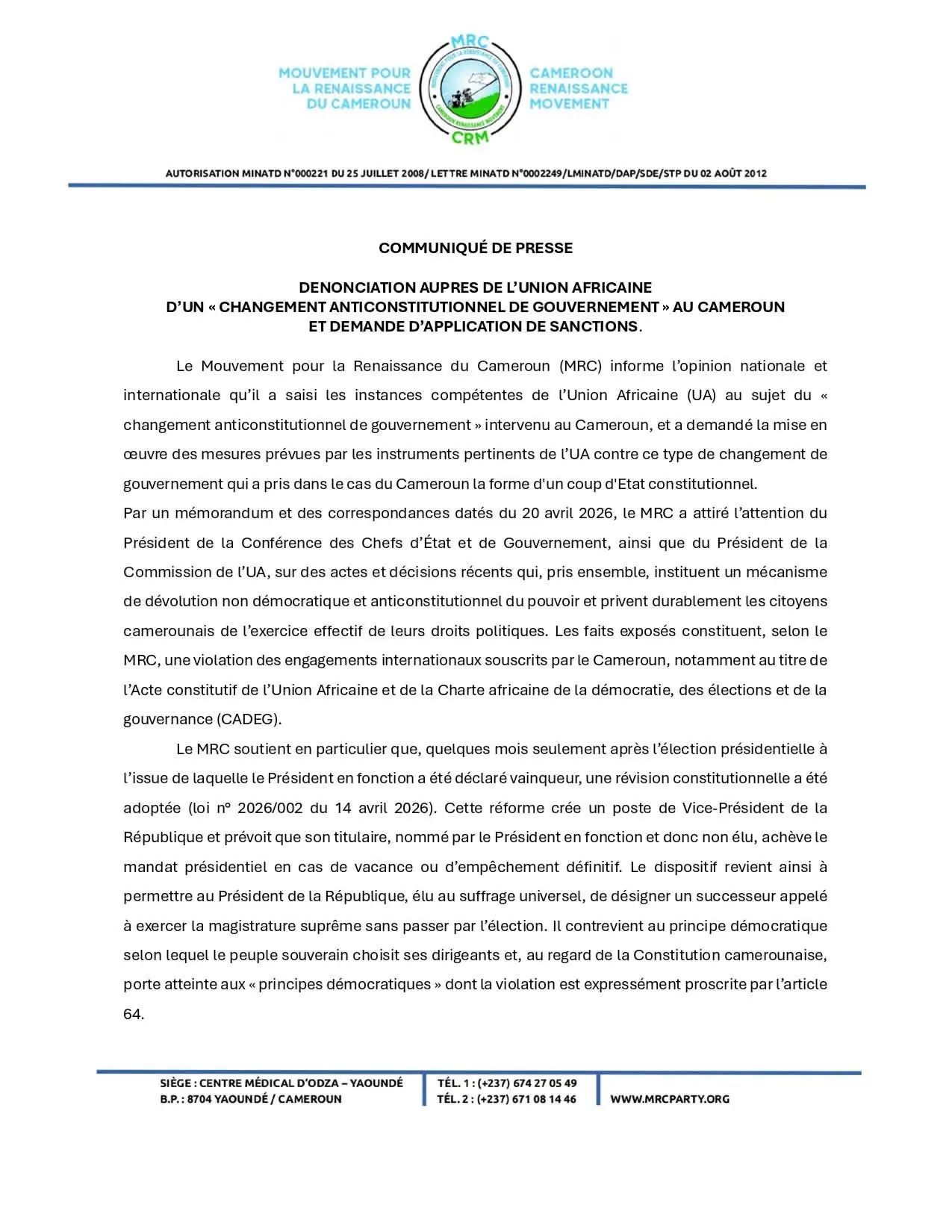 Le Mouvement pour la Renaissance du Cameroun a franchi une ligne le 20 avril 2026. Par mémorandum officiel adressé au Président de la Conférence des Chefs d'État de l'Union Africaine et au Président de la Commission de l'UA, le parti de Maurice Kamto dénonce ce qu'il qualifie de « changement anticonstitutionnel de gouvernement » au Cameroun et réclame l'application de sanctions prévues par les instruments africains.